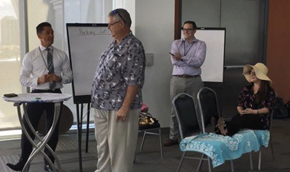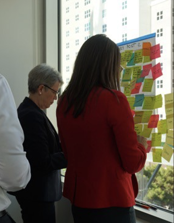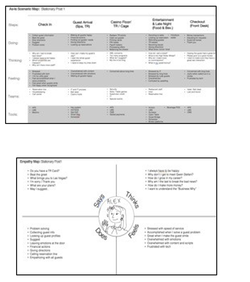 Small groups from Caesars, including front desk agents, F&B teams, VIP Hosts, Total Rewards, and supervisors, participated in Design Thinking exercises to understand common pain points among front-line employees and customers. The aim was to empathize with these personas and identify future-state solutions.