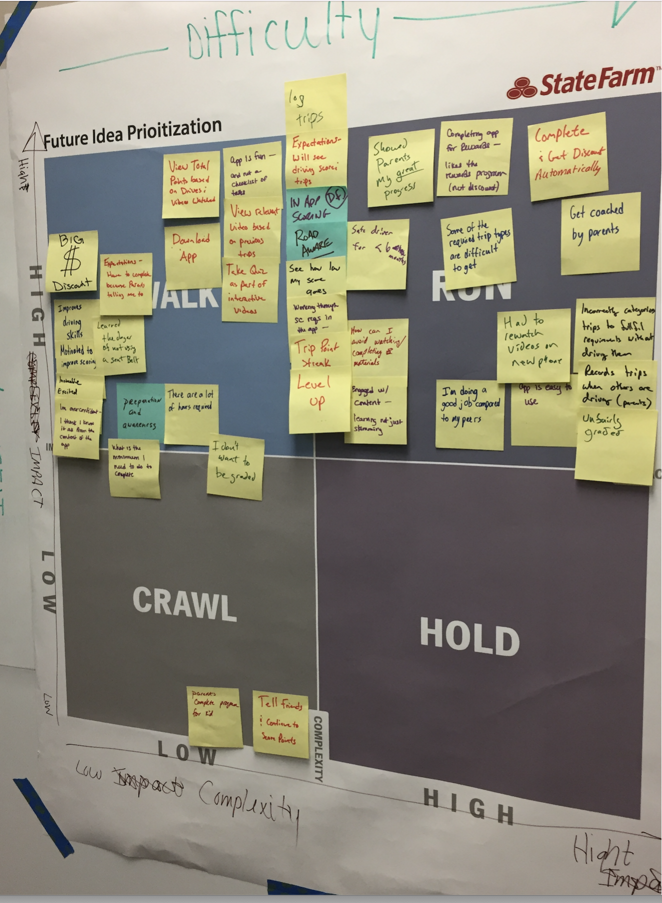 Small groups from State Farm, including developers, analysts, leadership, and Marketing, participated in Design Thinking exercises to understand customers' goals and frustrations. The aim was to empathize with these personas and identify future-state solutions.