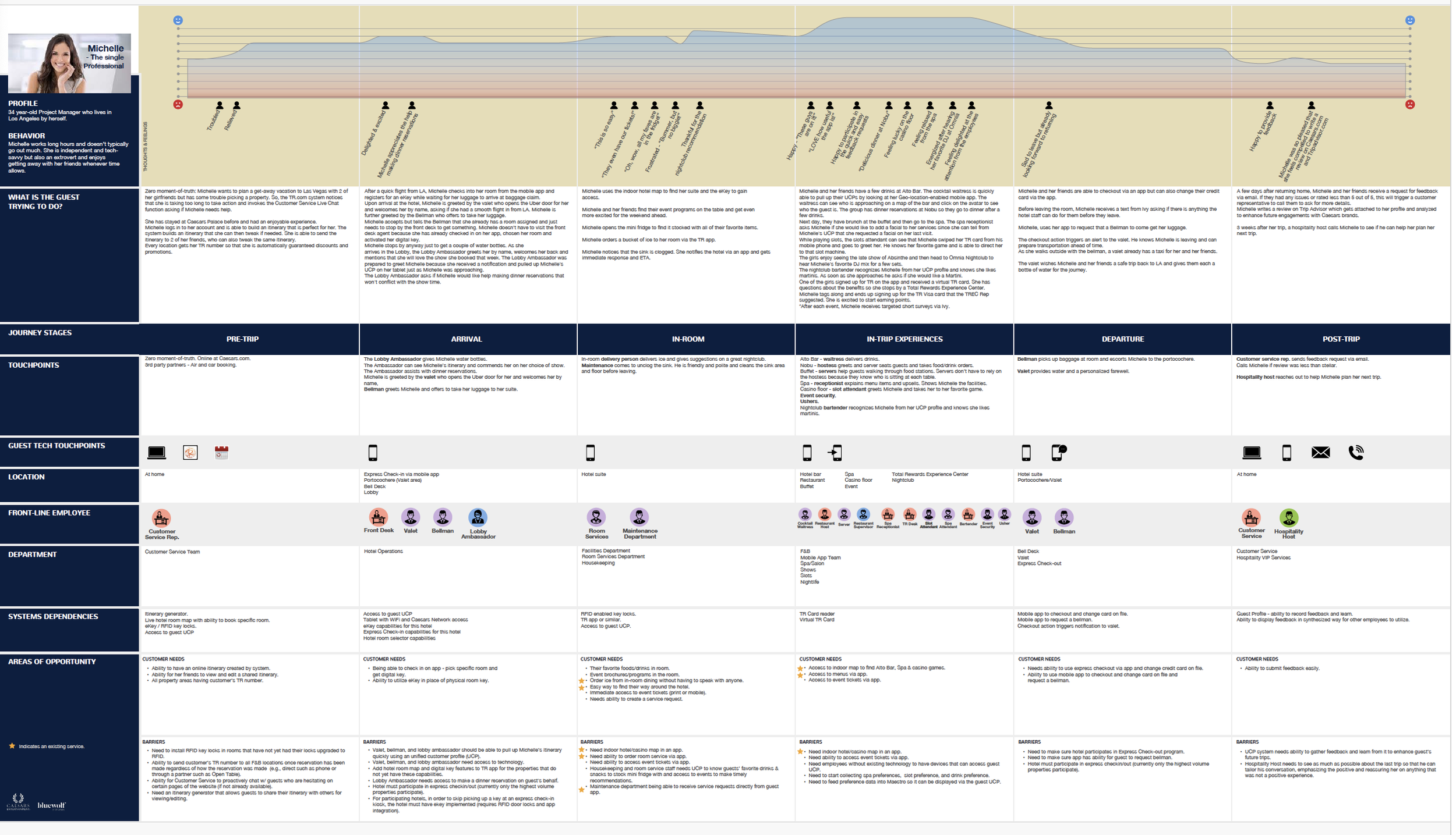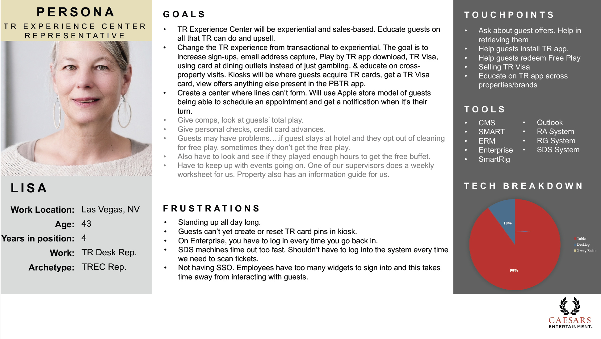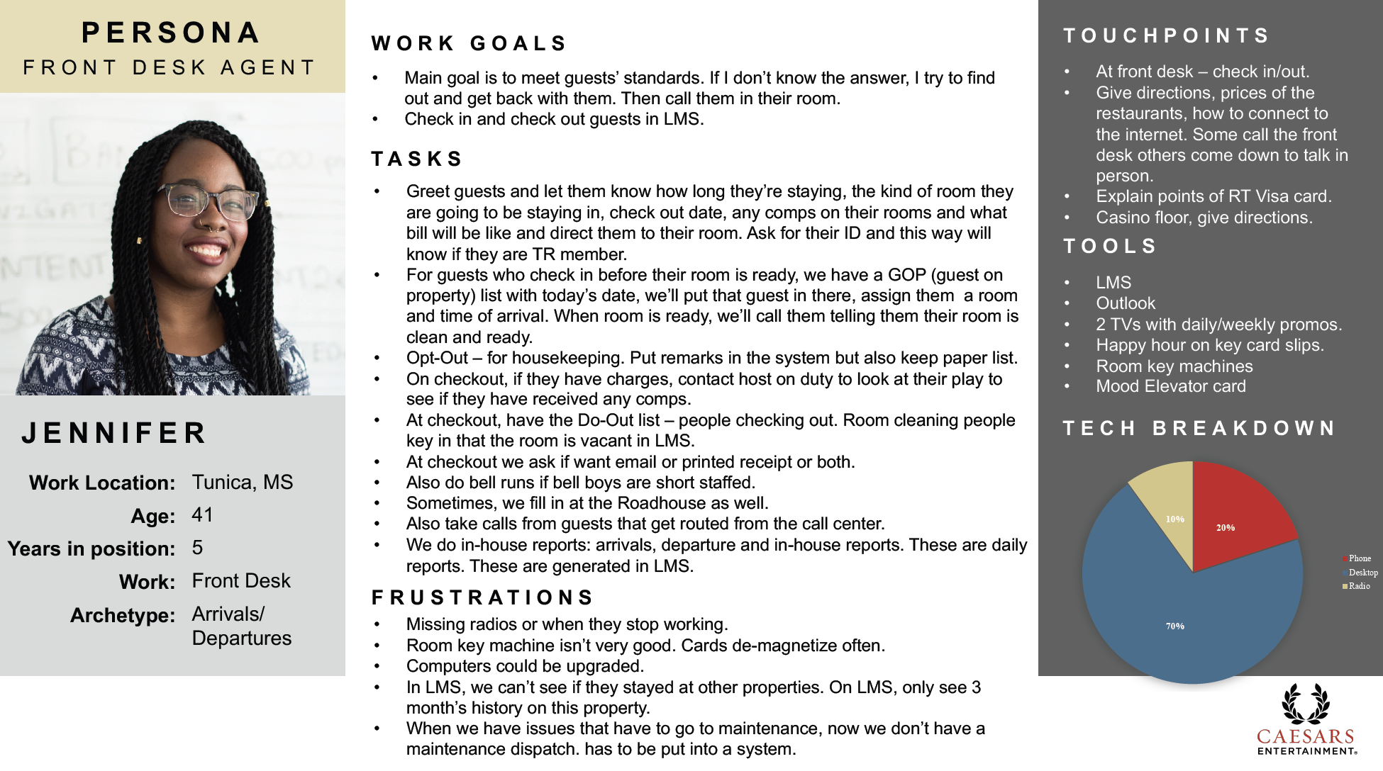 The interviewees represented a combination of destination markets, different comfort levels with technology, varying receptivity to change, and a range of tenures with Caesars. Based on interviews, data, and customer feedback, employee personas were created.